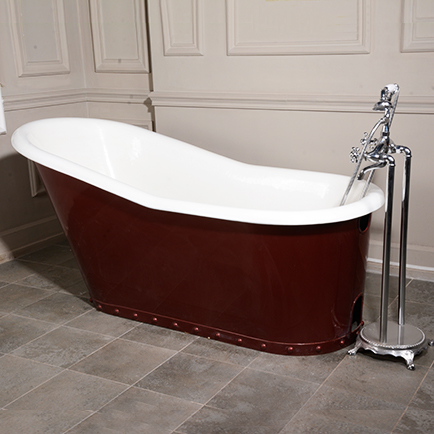 A simple painted metal skirt encases this luxurious cast iron slipper tub. With its steel skirt and classic design, this tub is sure to be a welcome addition to your home.